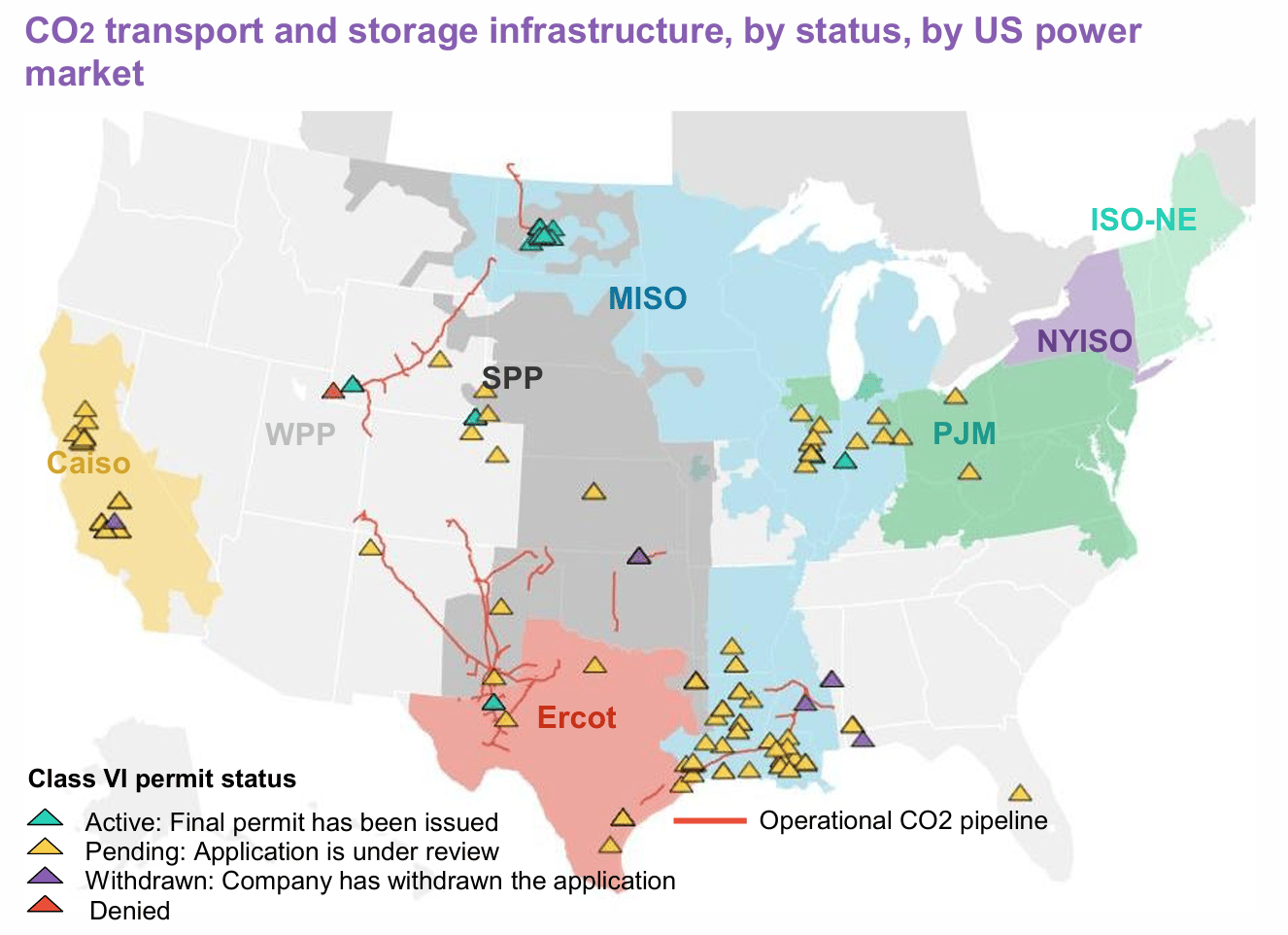 So, the growth of CCS — and major amounts of new fossil-fueled generation — could be on the horizon. Just check out the factbook’s map (below) detailing the CO2 pipelines and underground storage projects in development — all those little yellow triangles.