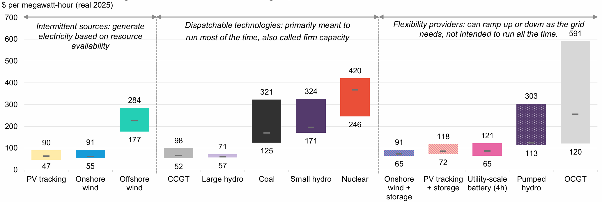 The chart above categorizes the different LCOEs for variable, dispatchable (24-7) and flexible (peak demand) power sources – that is, respectively, renewables; fossil fuels, hydro and nuclear; and storage and simple natural gas turbines.