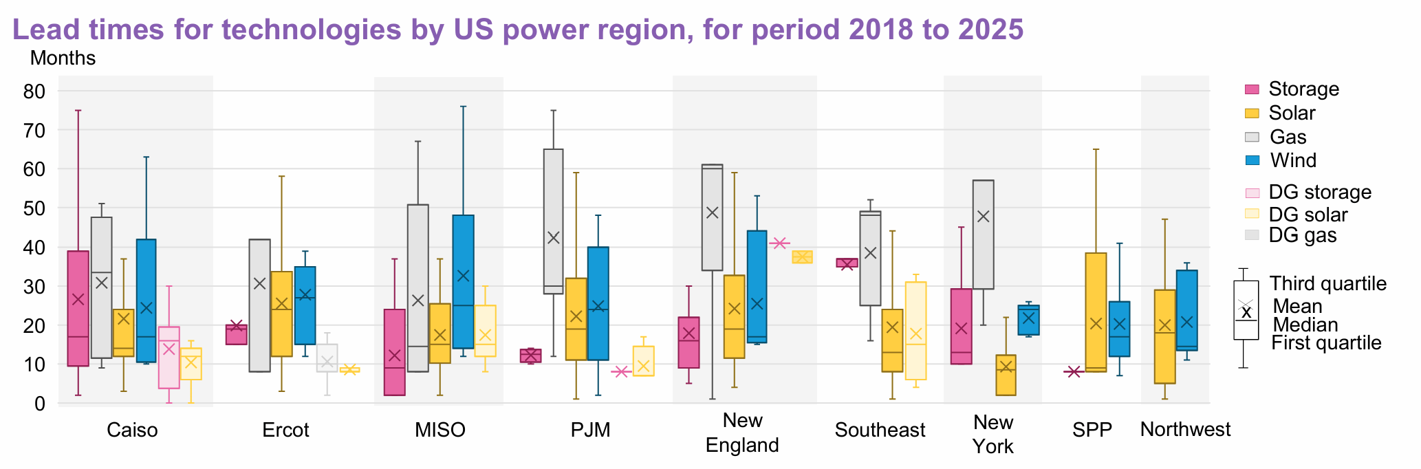 Now the overlay here is how long it takes to build the different technologies — what the chart below calls lead times — compared regionally across the nation’s regional grid operators.